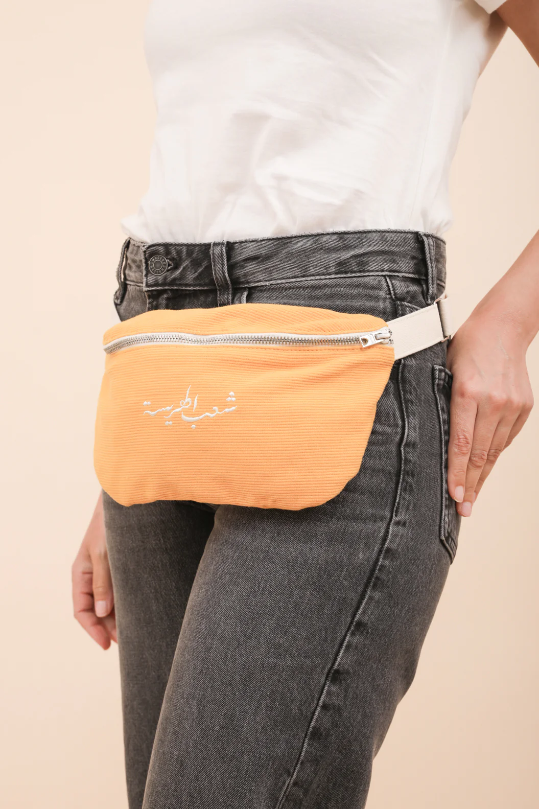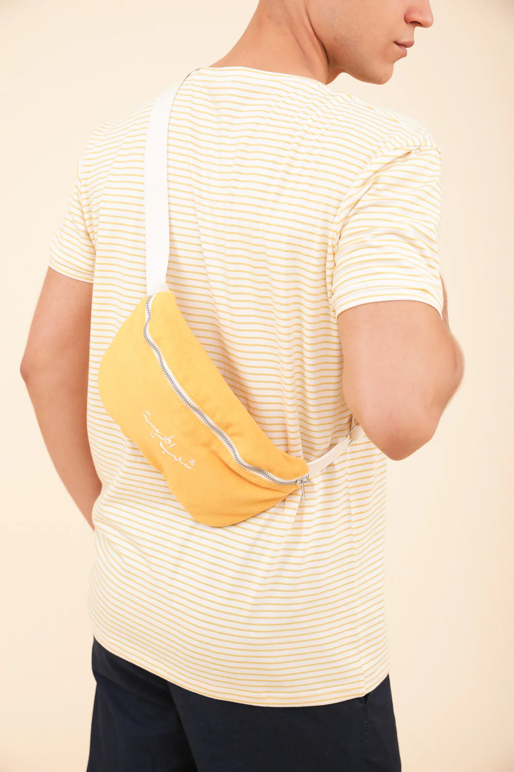 Le nouveau petit sac qui vous accompagnera partout cet été 🙂 – nouveau sac en toile 100% coton surteinte, zippé, couleur jaune – ‘Harissa People’ en calligraphie arabe brodé sur le devant en fil écru – sangle ajustable pour un porté épaule ou ceinture