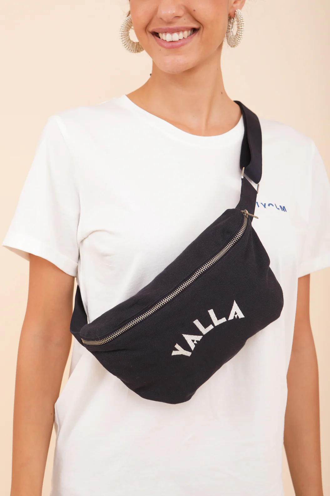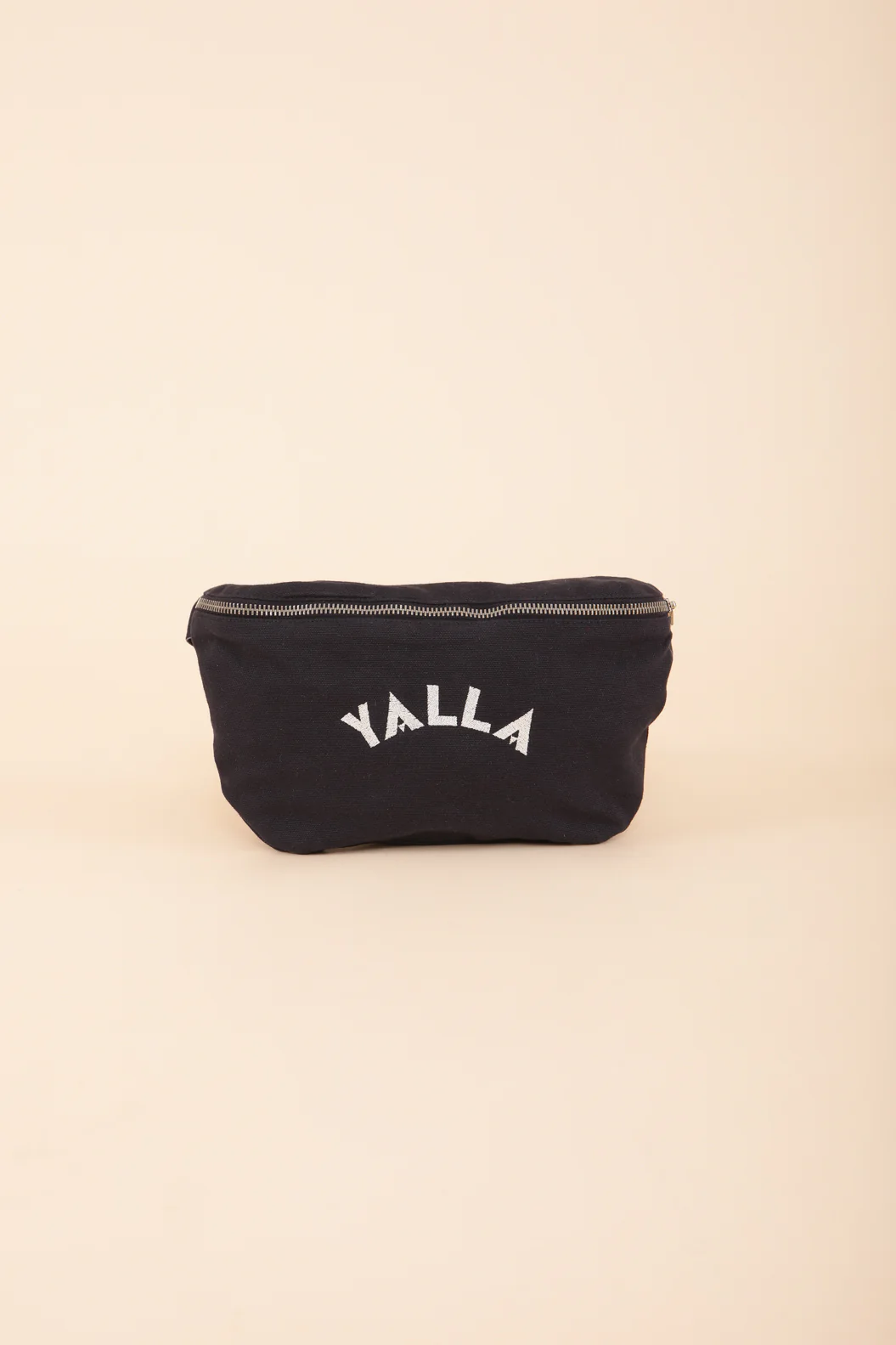Vous le portez à l’épaule ou à la ceinture ? – nouveau sac en toile 100% coton surteinte, zippé – belle couleur bleu navy – ‘yalla’ brodé sur le devant en fil couleur sable – sangle ajustable pour un porté épaule ou ceinture