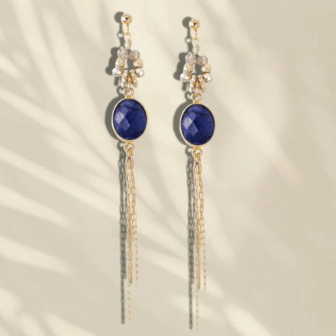Ces boucles d’oreilles longues sont montées sur une fine chaîne dorée en acier inoxydable au milieu de laquelle s’immisce une pierre semi-précieuse de Saphir. Des petites pierres de cristal viennent former une fleur juste au dessous du fermoir.