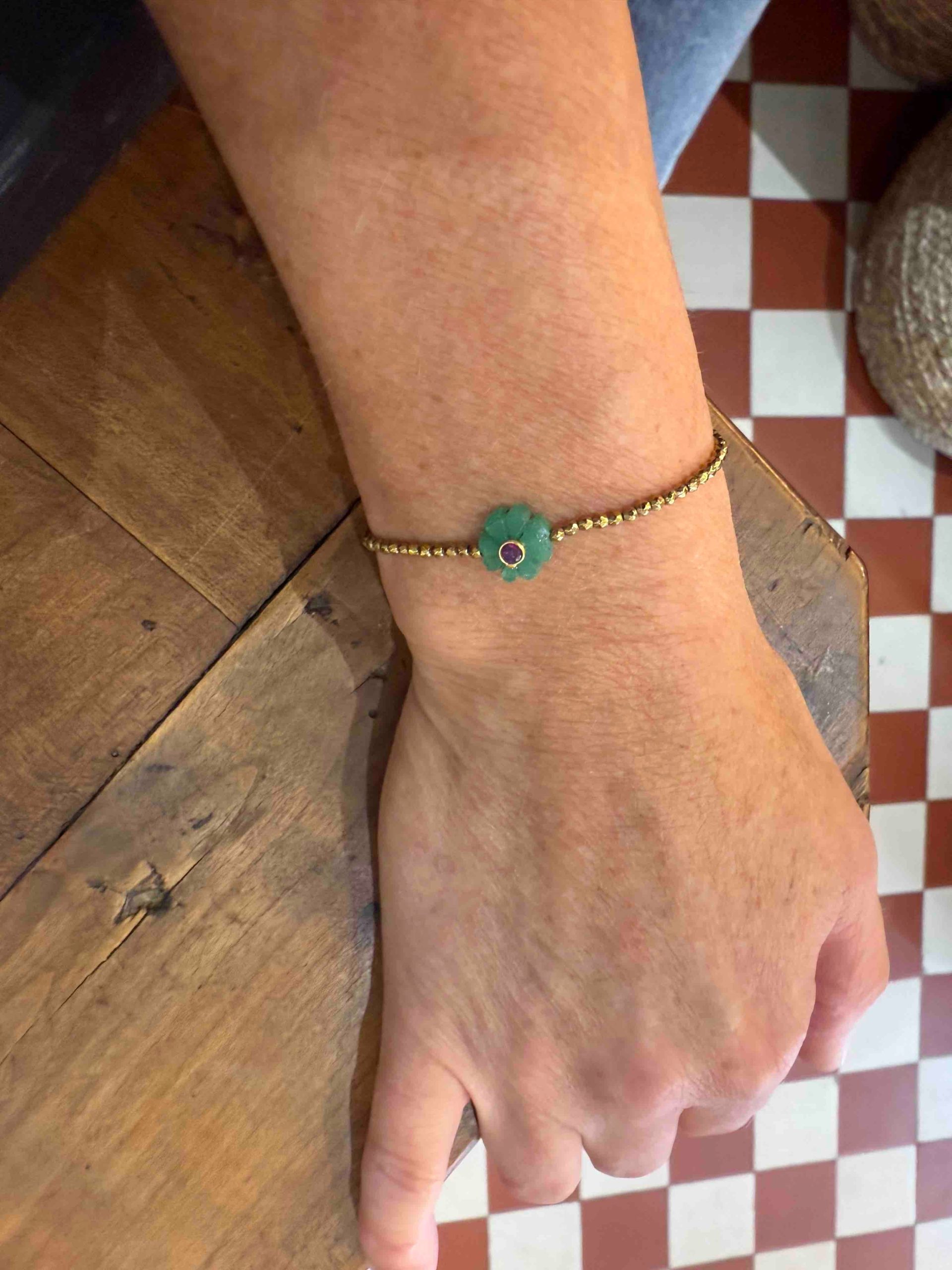 Ses perles dorées en hématite captent la lumière, tandis que la flower en pierre semi-précieuse, apporte une touche de couleur et de sens.