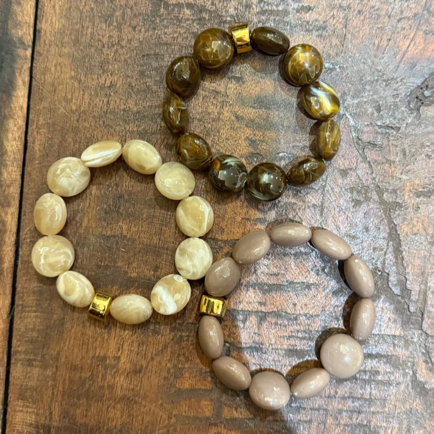 Les bracelets sont composés de 6 perles en acrylique ou résine de très belle qualité et une perle gravée PARABAYA en acier doré à l’or fin.
