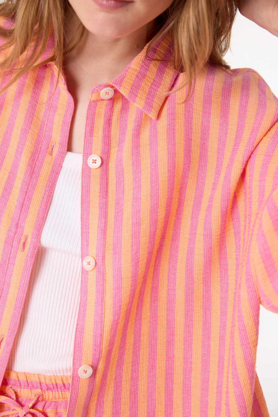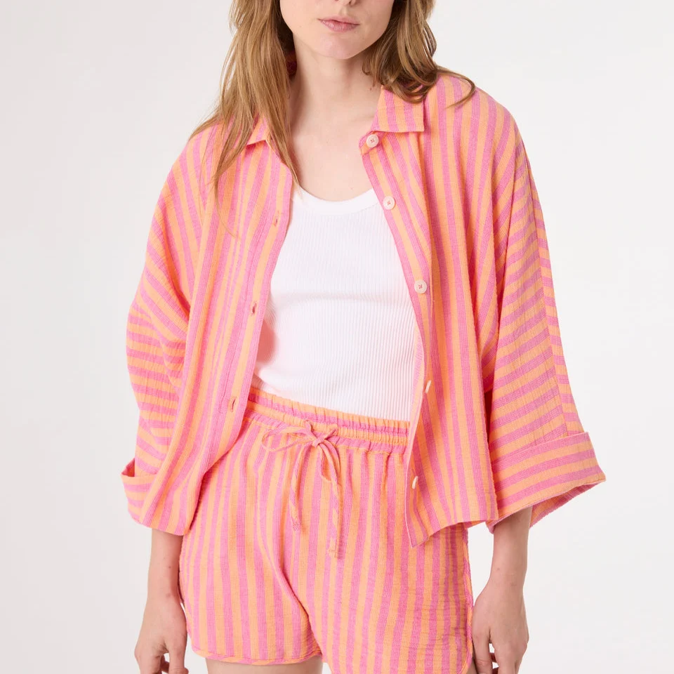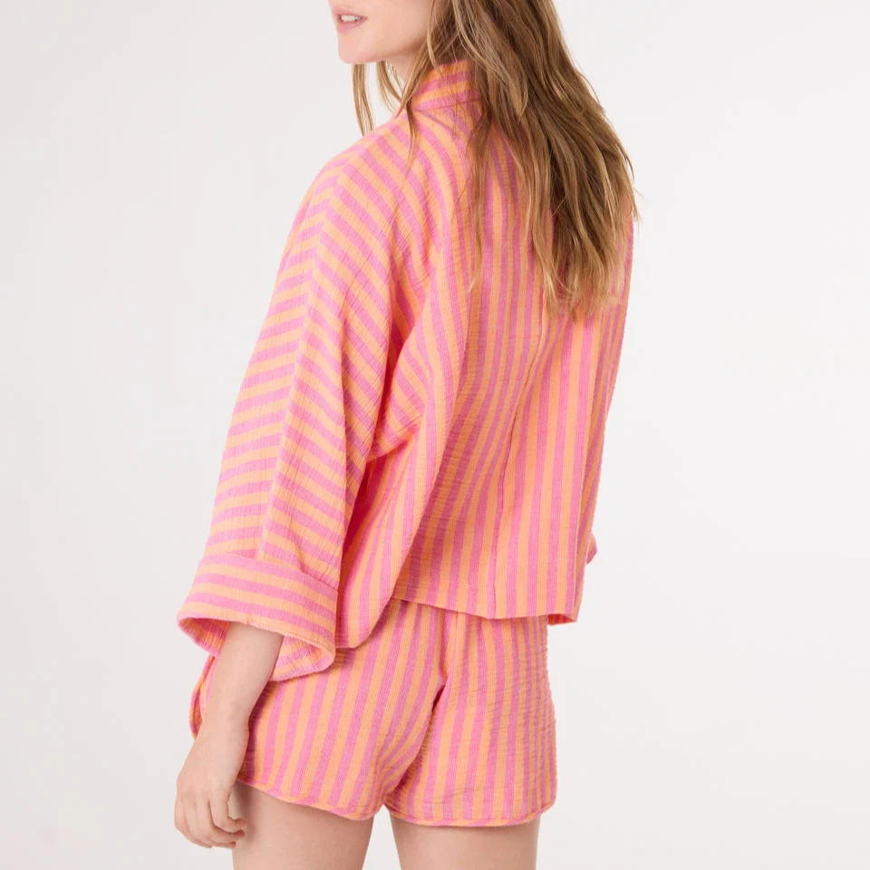 Chemise courte à la coupe oversize pour une allure moderne et décontractée, à rayures en gaze de coton. Ses manches longues kimono apportent du volume et du confort, tandis que son col chemise classique et son boutonnage apparent lui confèrent une touche intemporelle. Poignets larges en finition pour un style affirmé.