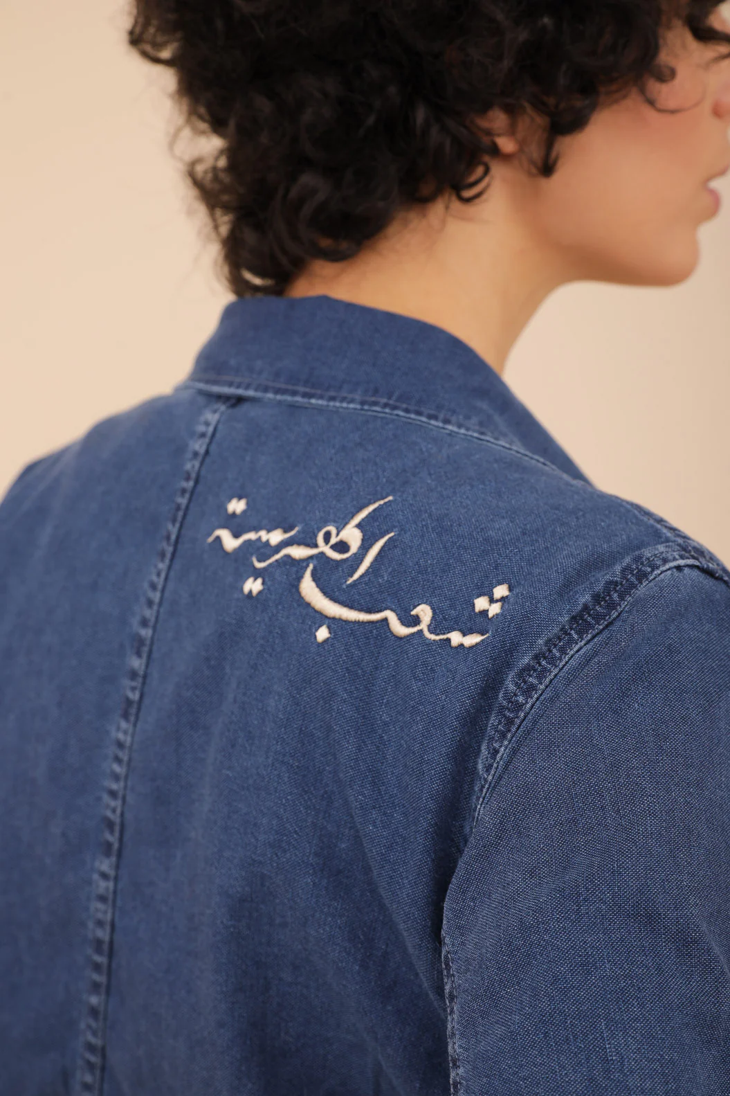 – élégante calligraphie brodée derrière l’épaule : ‘Peuple de la Harissa’ en arabe…