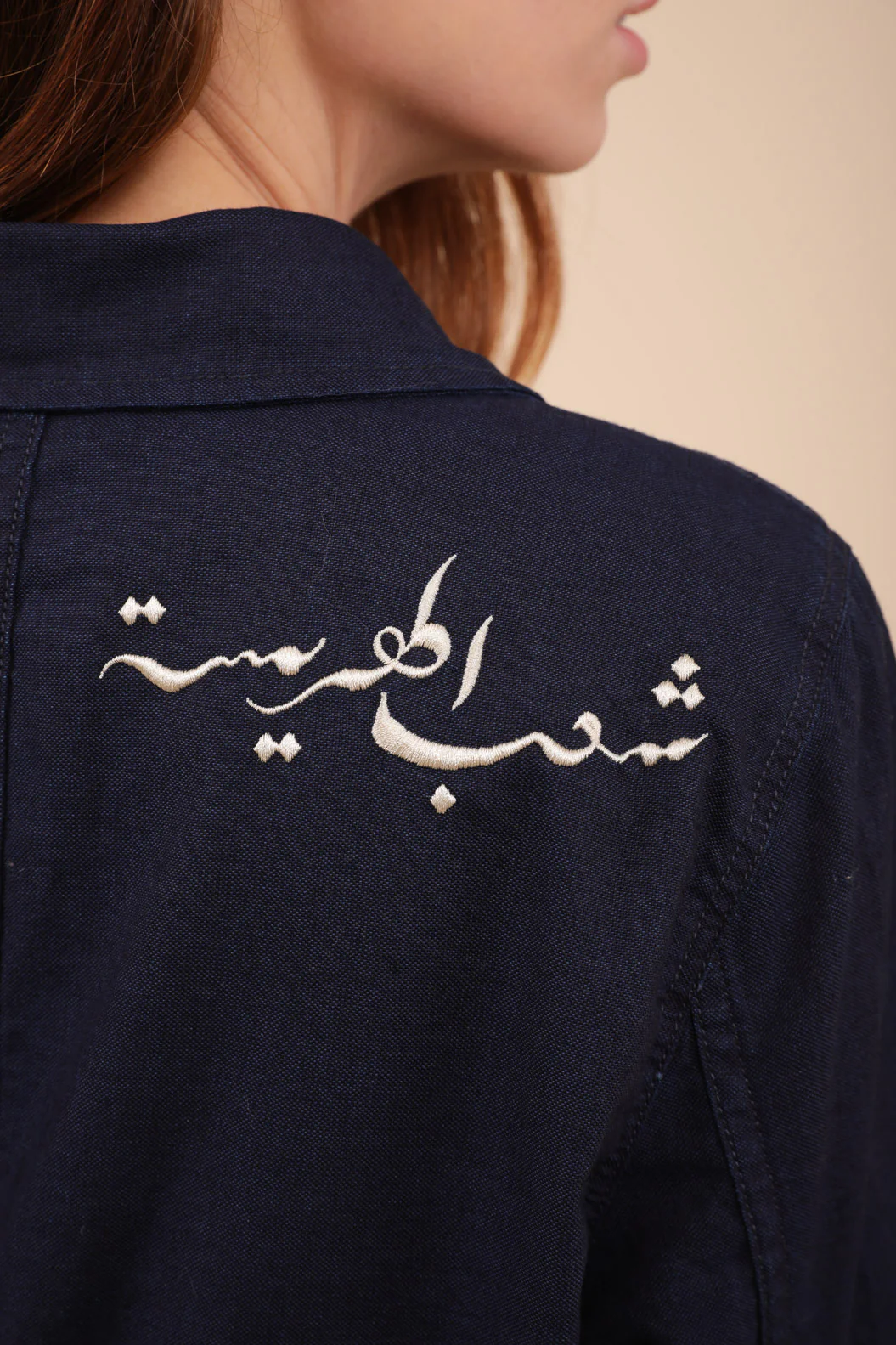 – élégante calligraphie brodée derrière l’épaule : ‘Peuple de la Harissa’ en arabe…