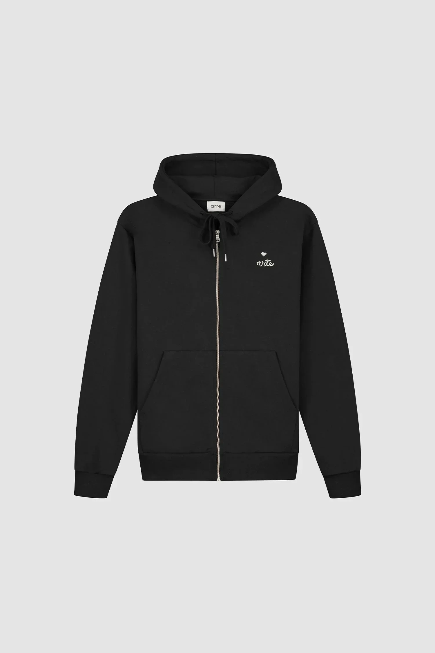 Fabriqué en coton épais de première qualité, ce sweat à capuche zippé présente les caractéristiques suivantes Cette saison, le logo en forme de cœur d’Arte est brodé en blanc sur le côté gauche de la poitrine. Le sweat à capuche noir a une coupe décontractée et est doté d’une fermeture éclair sur toute la longueur, de cordons de serrage et de deux poches latérales.