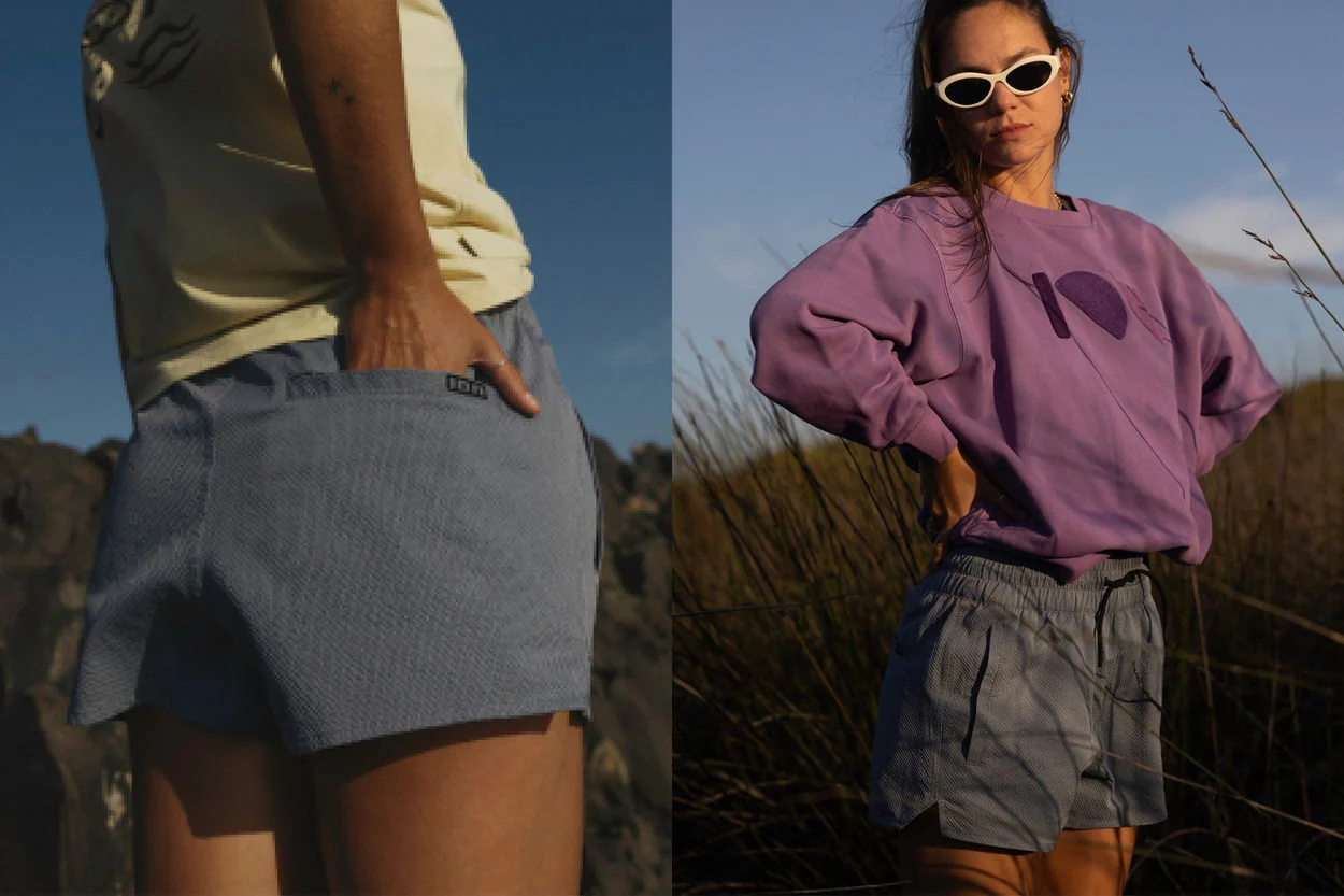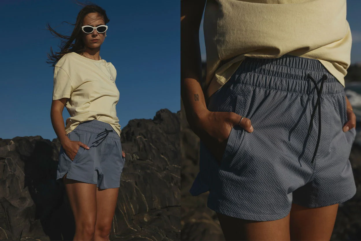 Nouveau boardshort en crêpe à séchage rapide, avec une sensation unique sur la peau, et une coupe droite et taille haute.