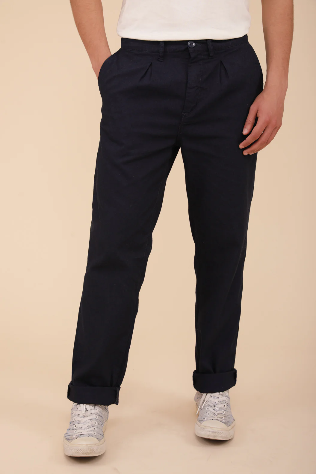 – 5 poches brut, bleu nuit, coupe droite, couture contrastée bronze et braguette zippée.
