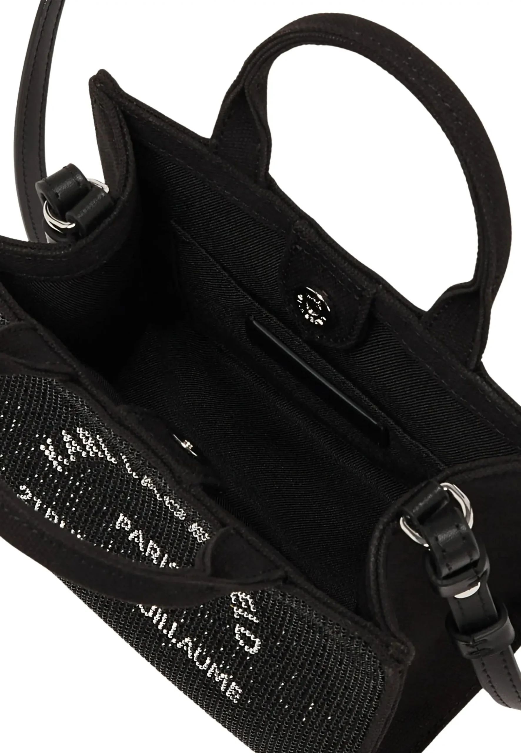 Ce cabas Karl Lagerfeld transforme chaque sortie en déclaration de style. L’ornement intégral en strass scintillant sublime l’illustration emblématique Rue St-Guillaume, créant un accessoire qui capture l’essence de la maison parisienne.