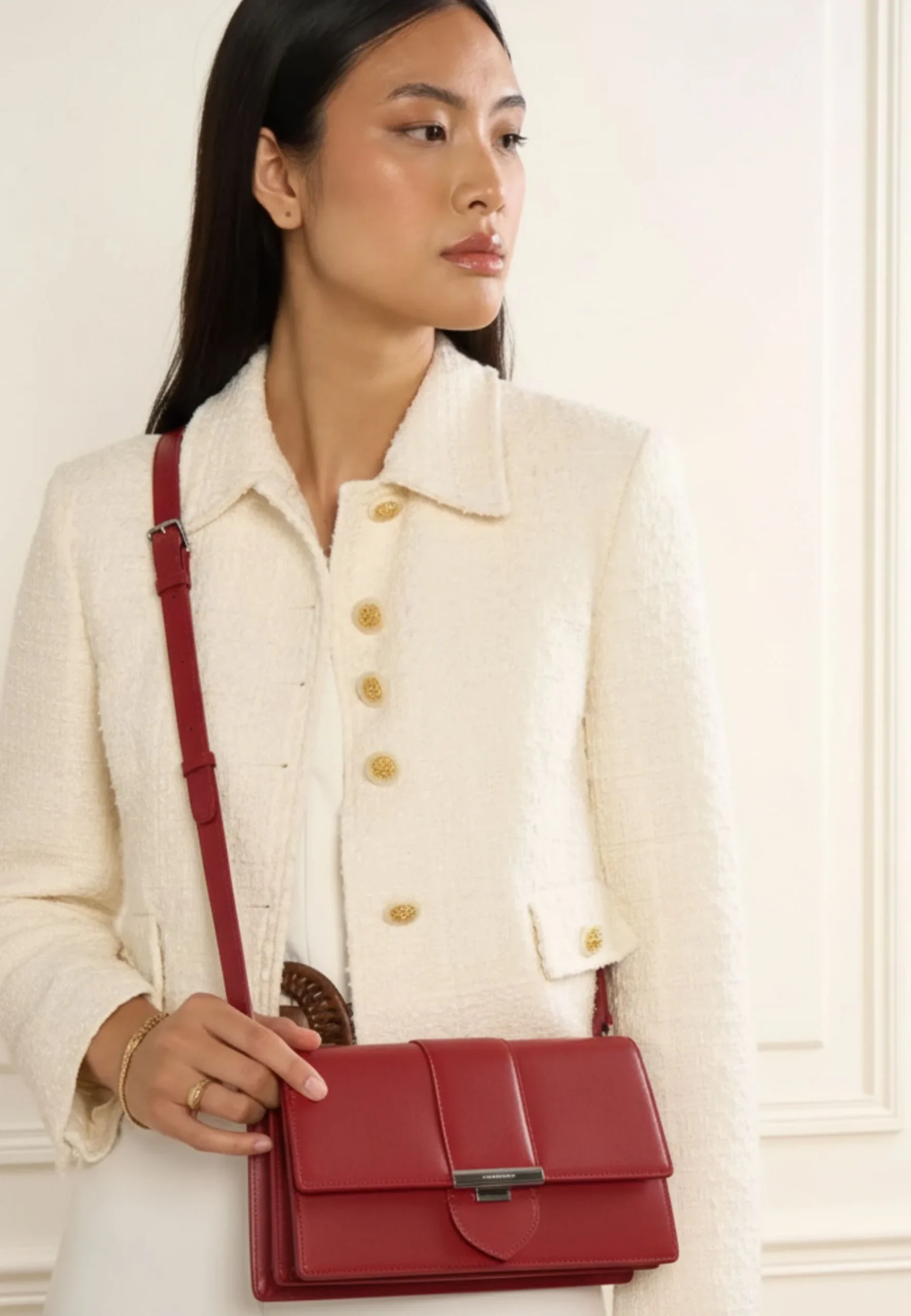 Cette nuance carmin sophistiquée se marie harmonieusement avec un trench beige et des escarpins nude pour un look professionnel. Pour une tenue décontractée, associez-le à un jean brut et une blouse blanche avec des baskets blanches en cuir.