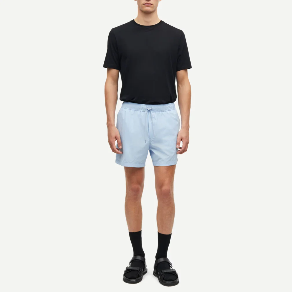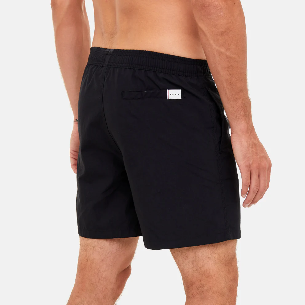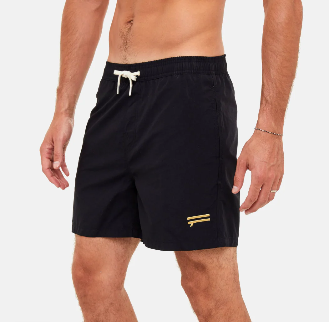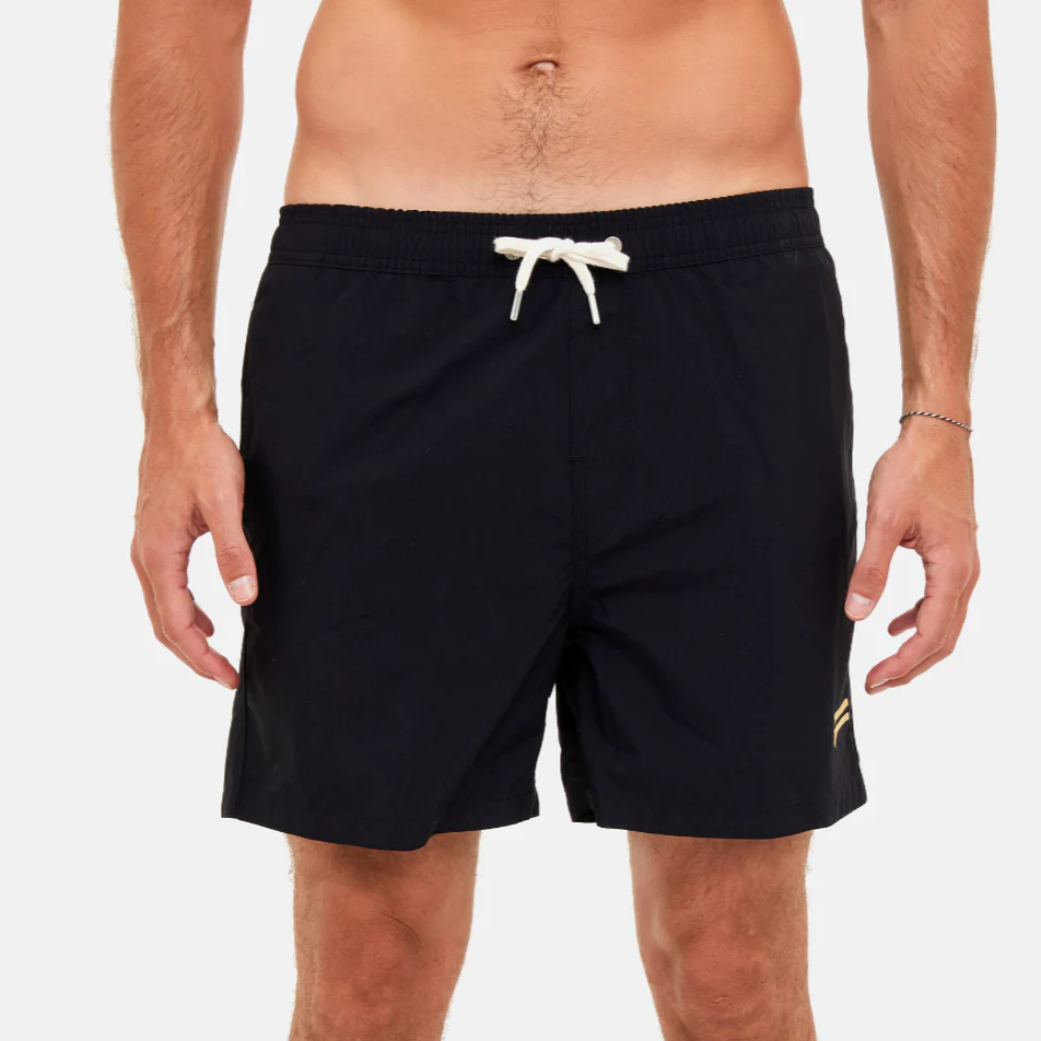 Le PAKO est un short de bain noir au toucher peau de pêche avec une taille élastiquée et un filet intégré. Sa coupe est classique avec une longueur mi-cuisse.