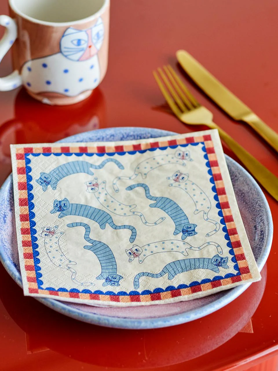 La Serviette Missy de Bloomingville est proposée en paquet de 20 et fabriquée en papier en FSC® mix. Elle présente un motif coloré de chats accompagné du texte amusant « Don’t stress meowt », apportant une touche ludique et pleine d’humour à la table. Idéale pour des moments conviviaux et détendus.