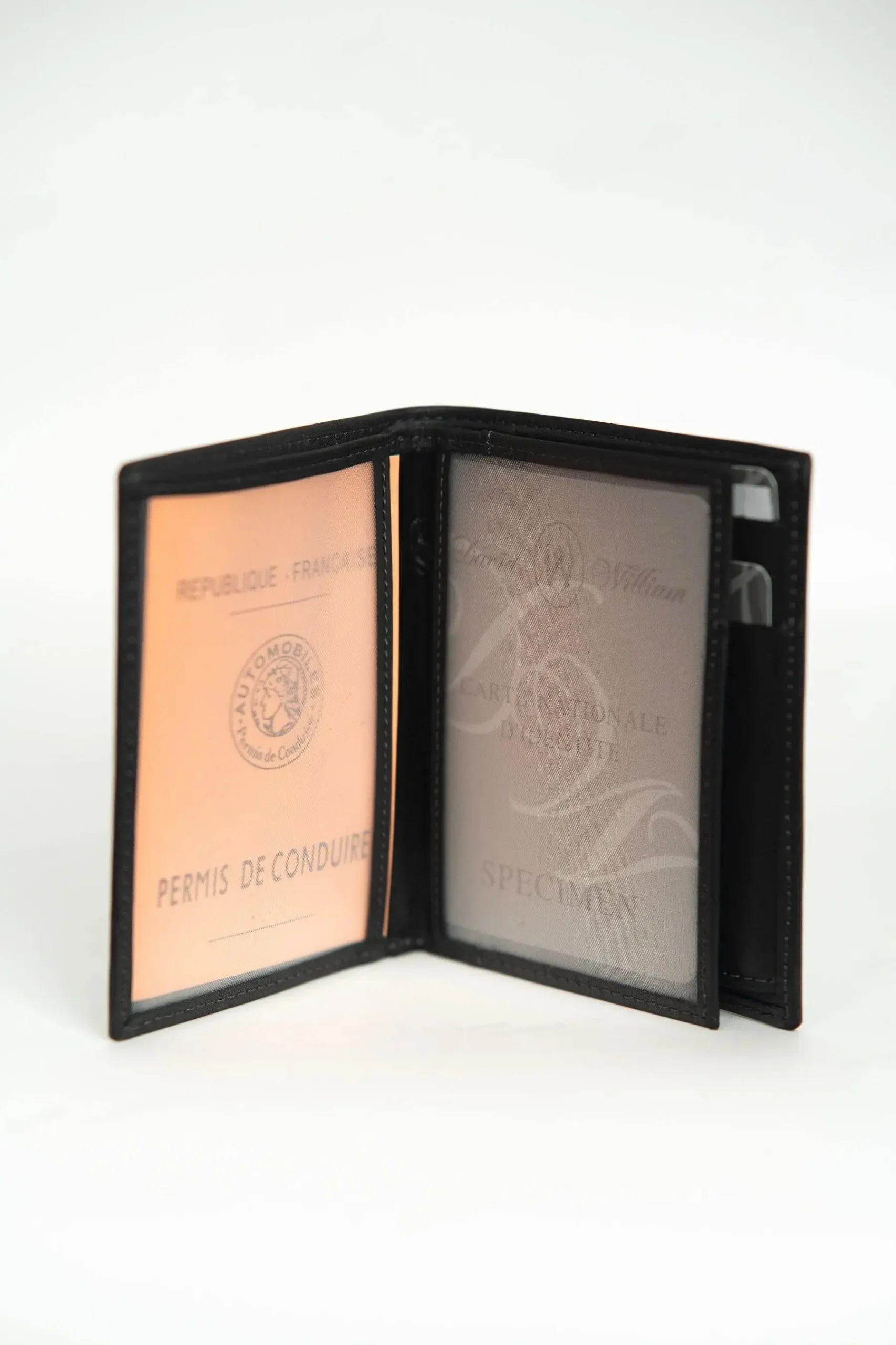 Portefeuille 3 volets signé David William Portefeuille cuir de vachette format Européen signé par David William, 3 volets pour les papiers, photos, permis de conduit, carte nationale, identité, porte-monnaie par un zip, six portes cartes de crédits. Matière : cuir de vachette pleine fleur Dimension : L9.50 x 12.50cm