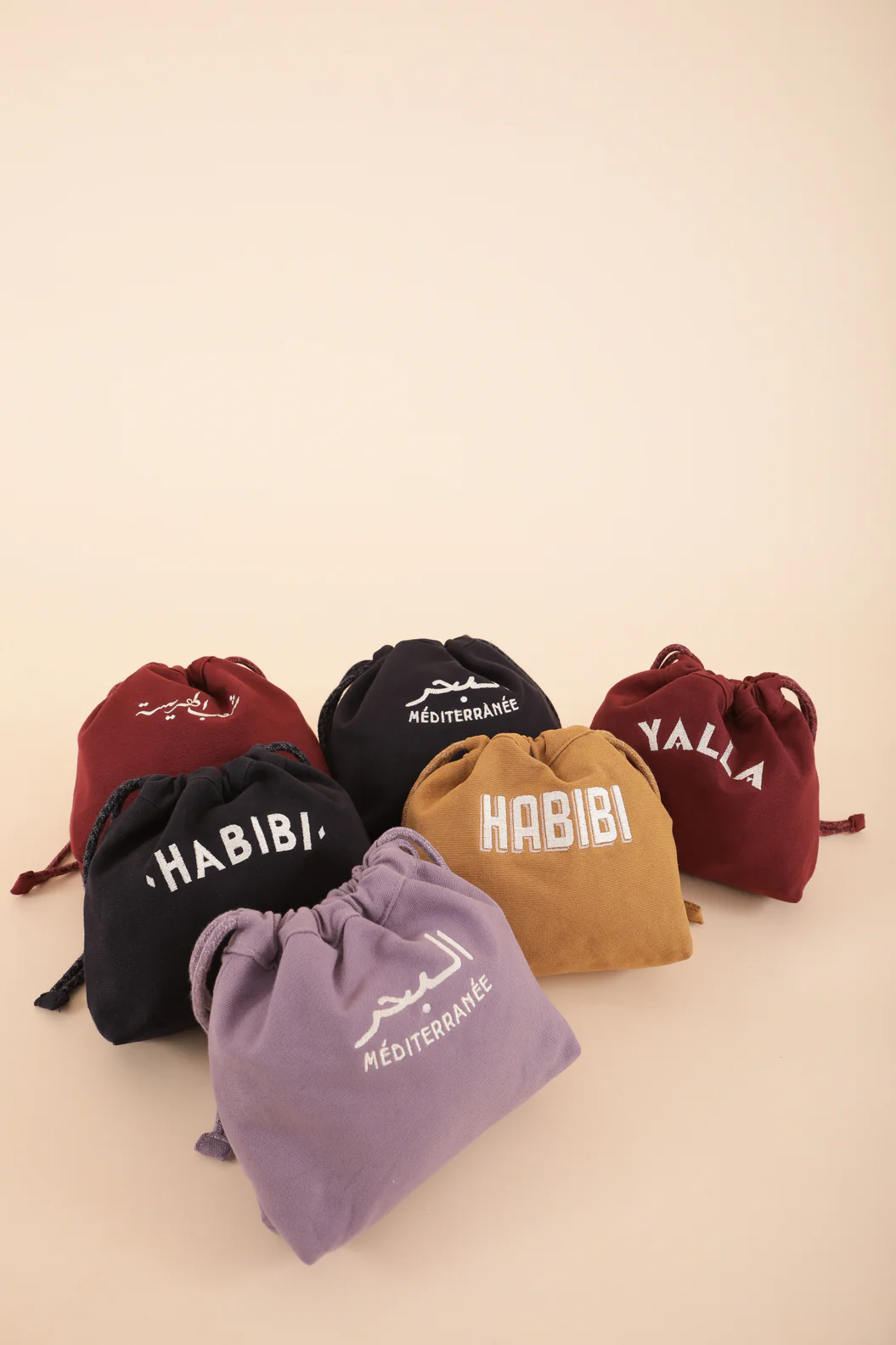 – notre message ‘Habibi’ (‘Mon Amour’ en arabe) brodé sur un côté, en fil couleur sable