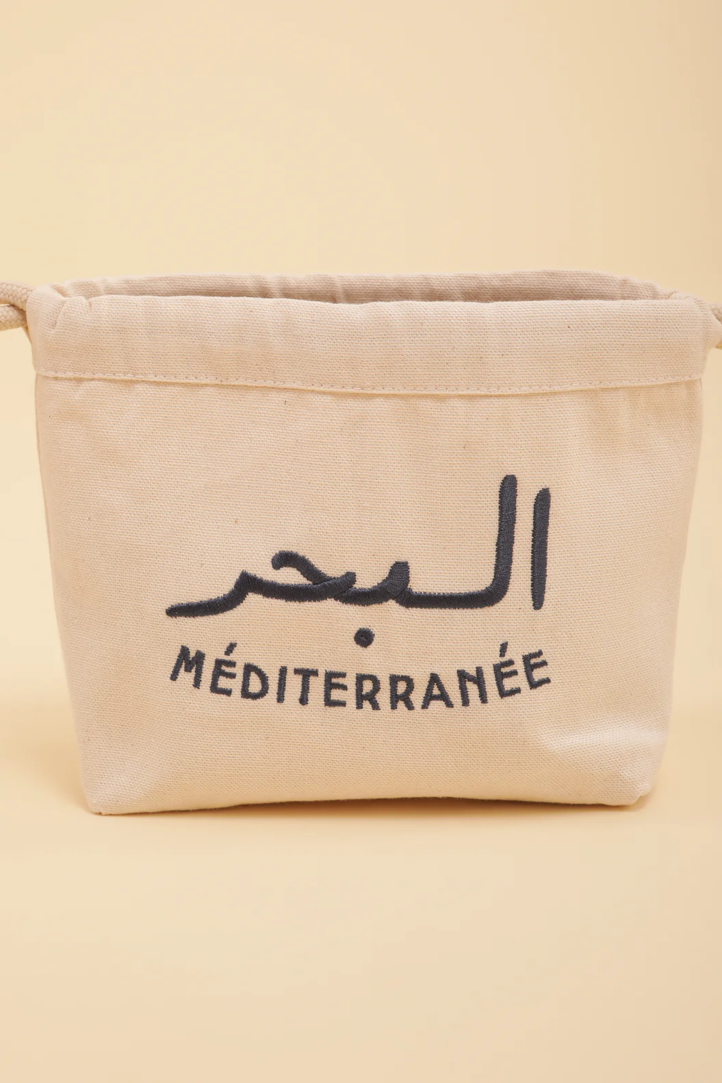 – notre message exclusif ‘La Mer méditerranée’ en arabe/français brodé sur un côté, en fil bleu navy.