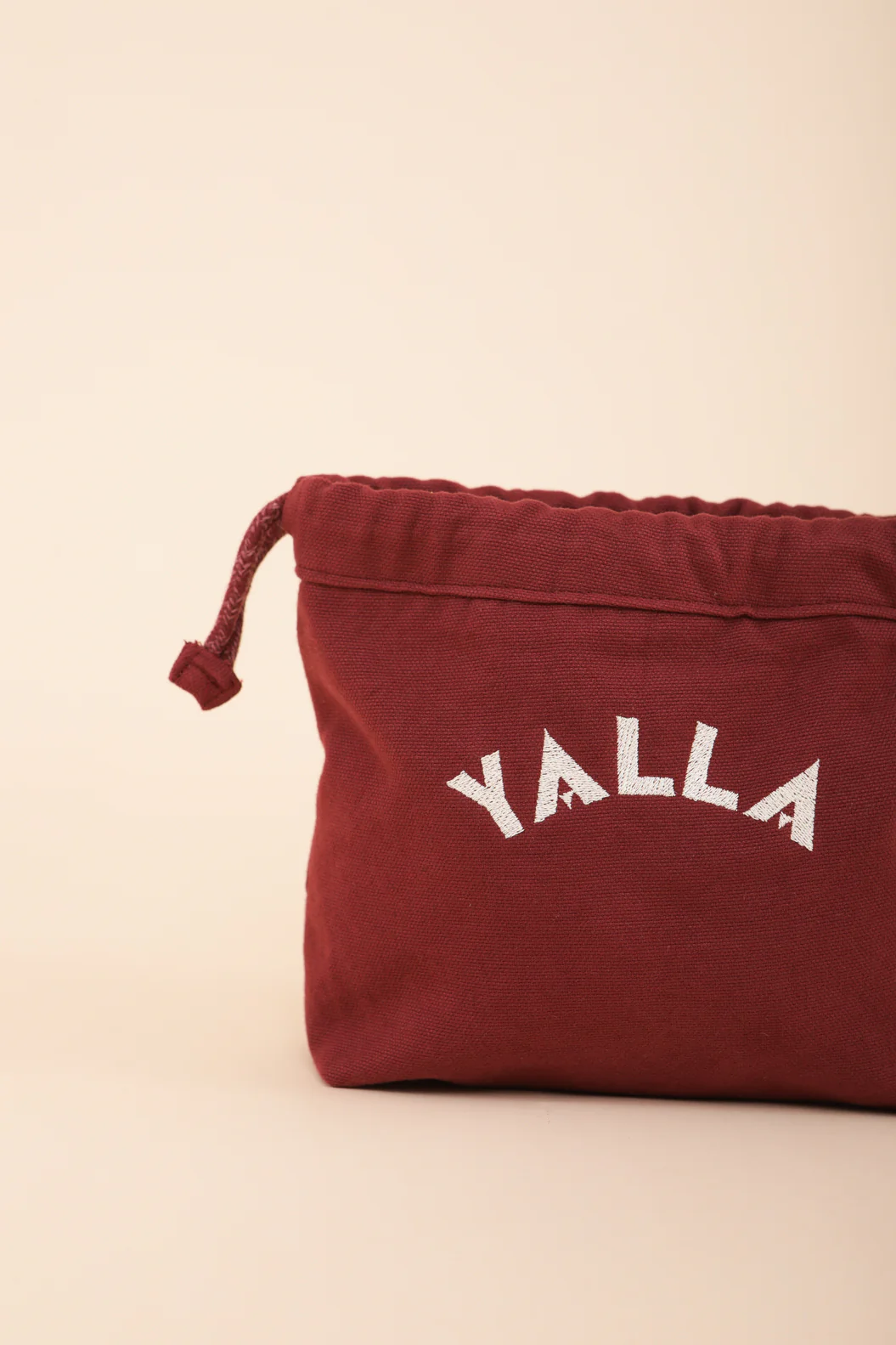 – notre message ‘Yalla’ brodé sur un côté, en fil couleur sable