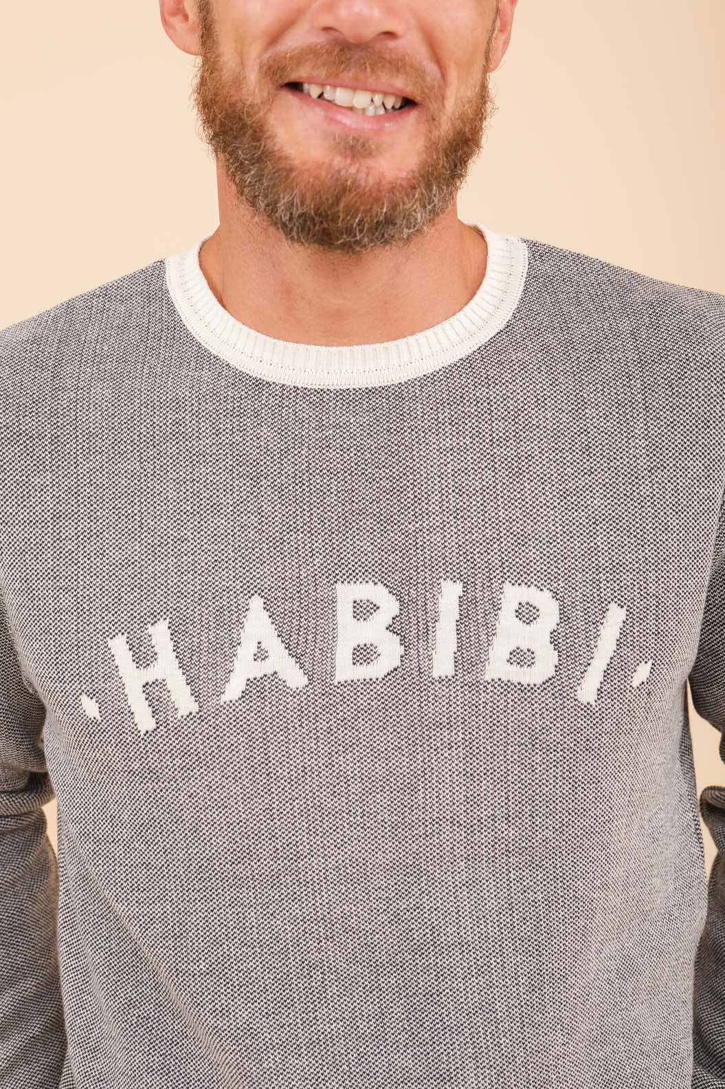 – ‘Habibi’ (‘Mon Amour’ en arabe) tricoté sur le devant.