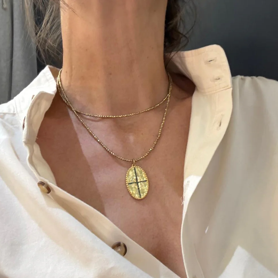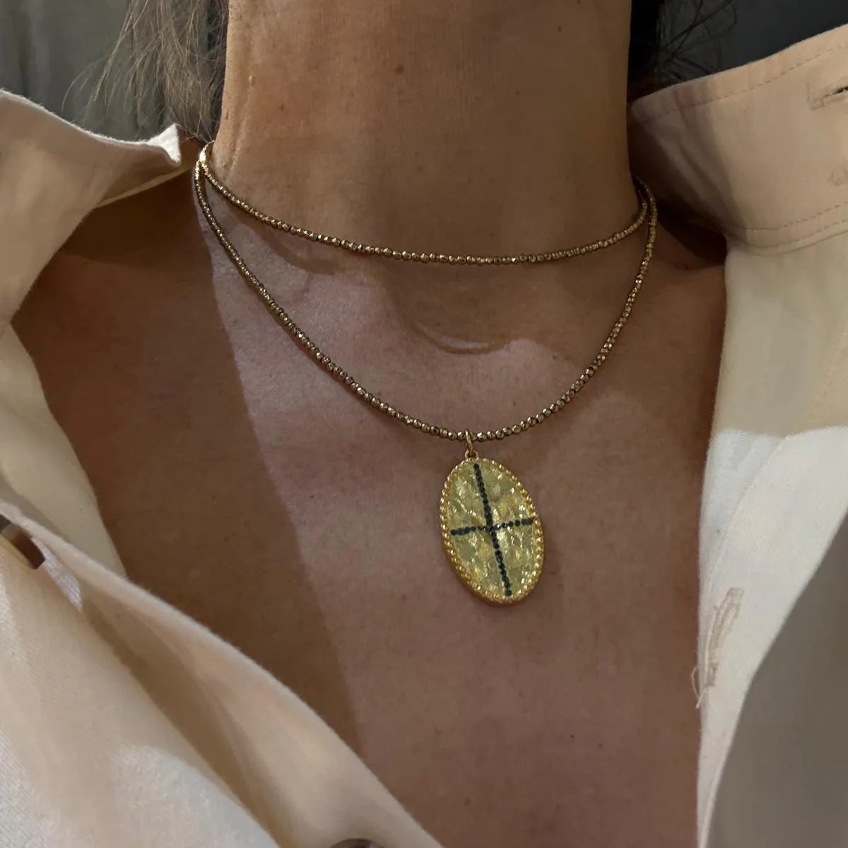 Sautoir réalisé avec des hématites et un pendentif en plaqué or 3 microns incrusté de pierres semi-précieuses. Il mesure environ 70cm, on le porte en sautoir ou en collier double tour.