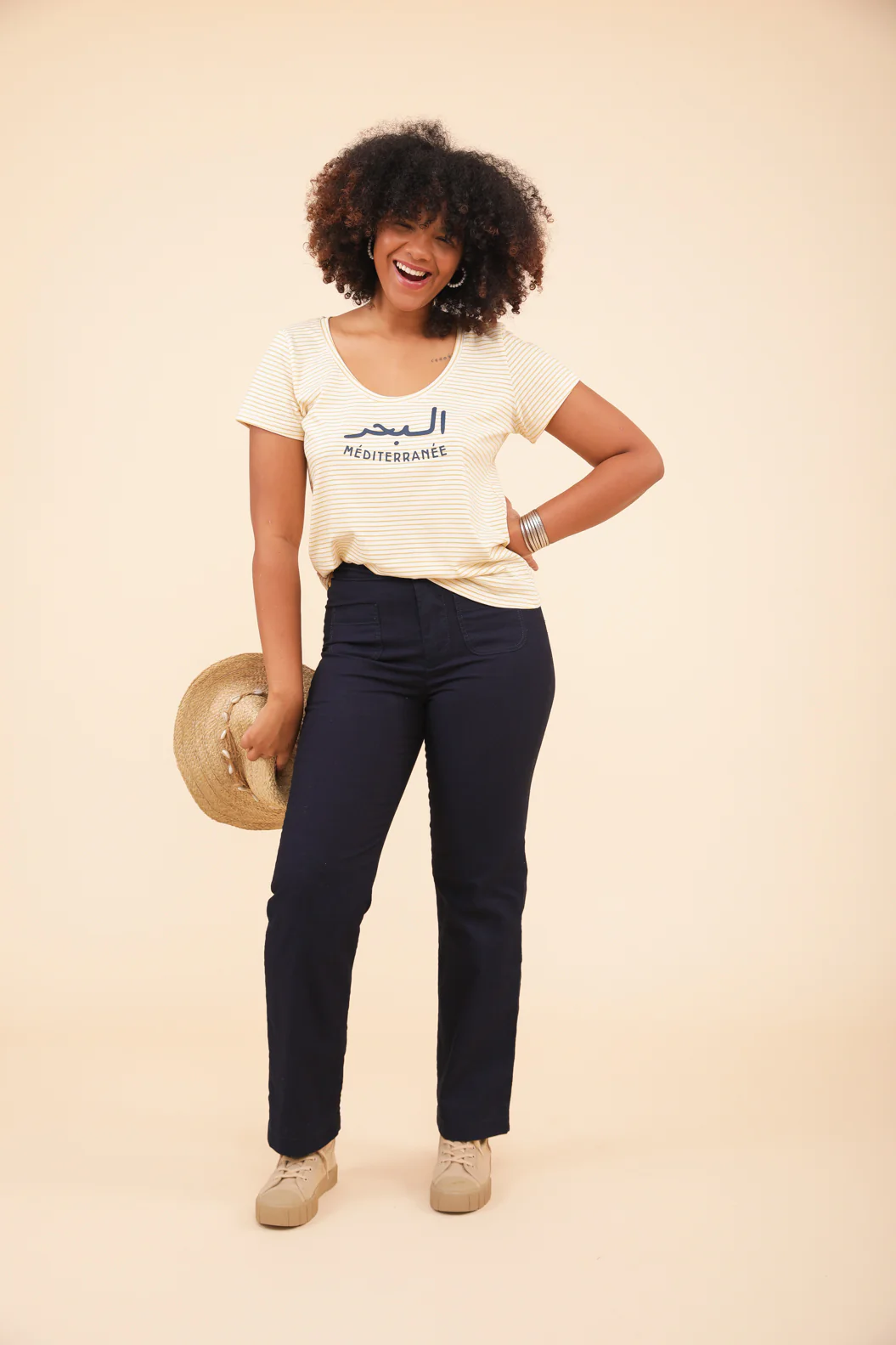 Découvrez notre t-shirt ‘marinière-méditerranée’.