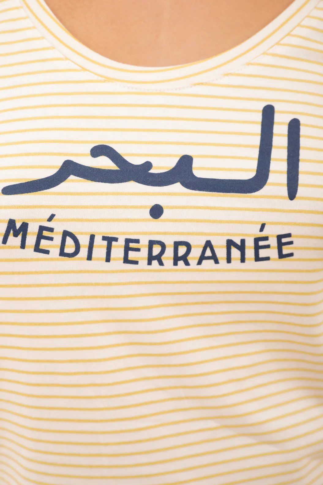 – Message iconique sur le devant : Mer Méditerranée en mix arabe-français.