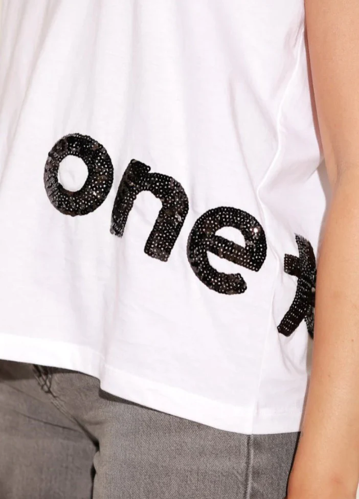 • Sequins noirs « ONE » à l’avant et « TEE » au dos