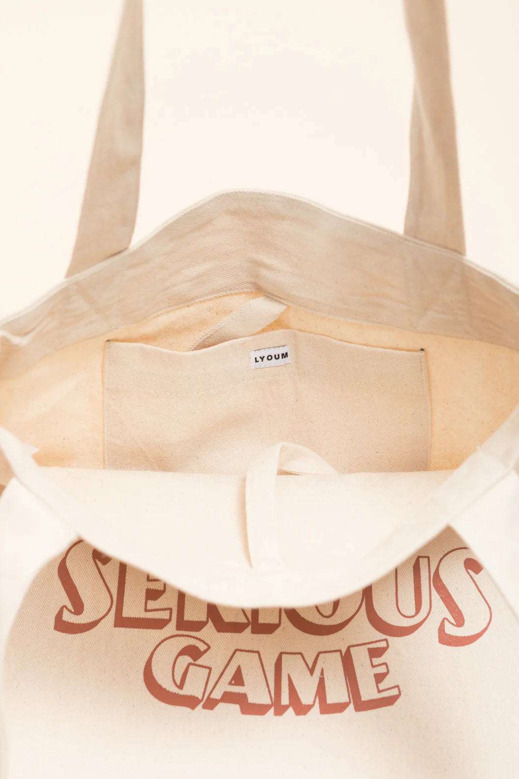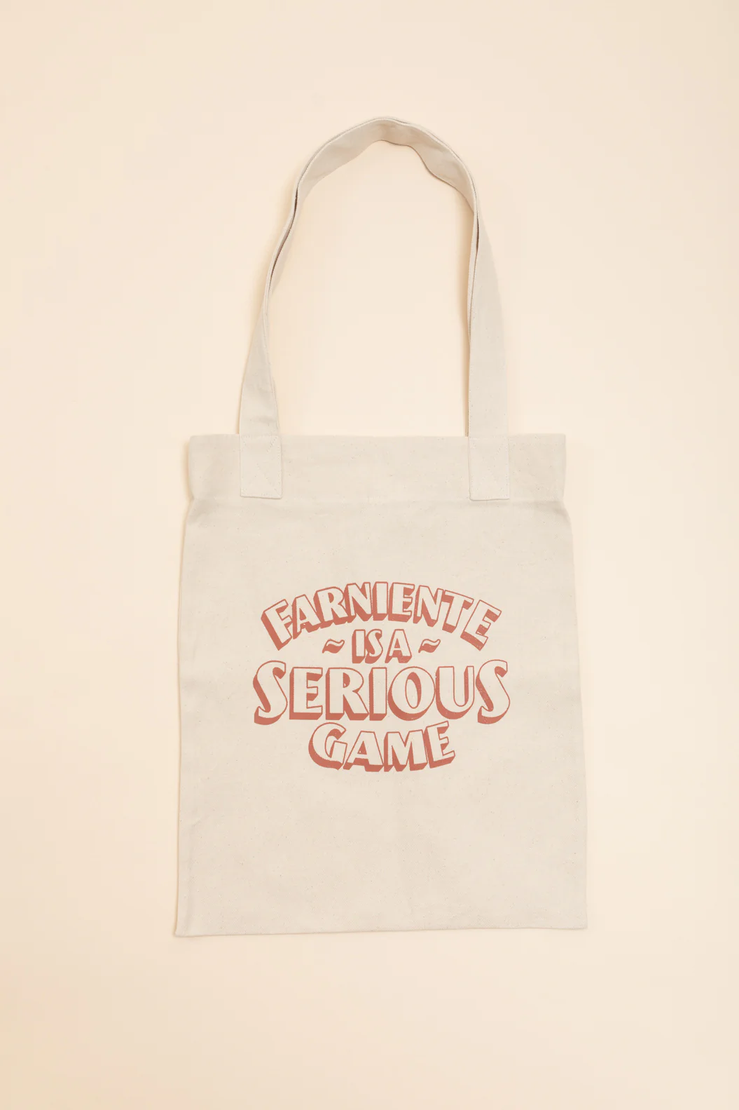 Tote Bag écru, anses et poches intérieures. Serigraphie ‘Farniente is a Serious Game’ sur un côté, couleur terracotta. Dimensions: Largeur 37cm, hauteur 44.5cm.