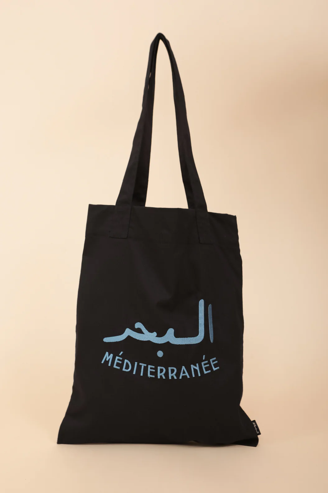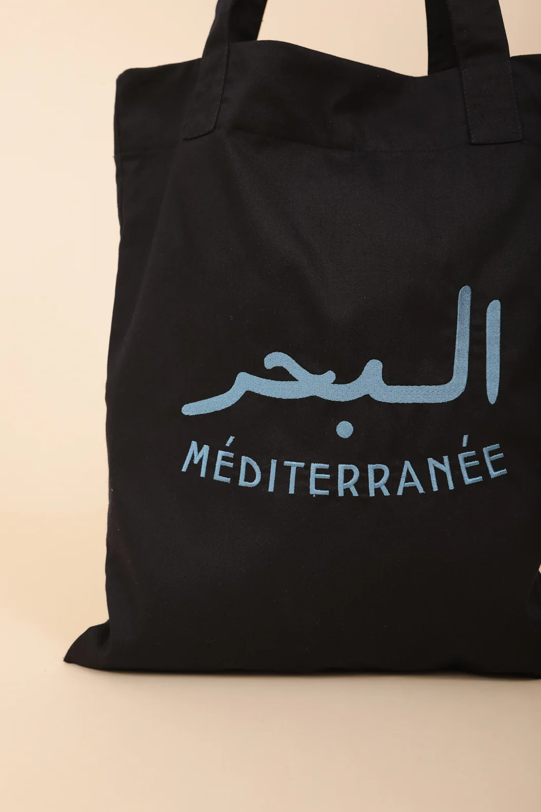 Nouveau tote nouvelle couleur ! Tote Bag en toile, avec poche et anses intérieures, couleur bleu navy.Broderie ‘La Mer Méditerranée’ en mix arabe/français sur un côté. Dimensions : Largeur 37cm, hauteur 44.5cm.