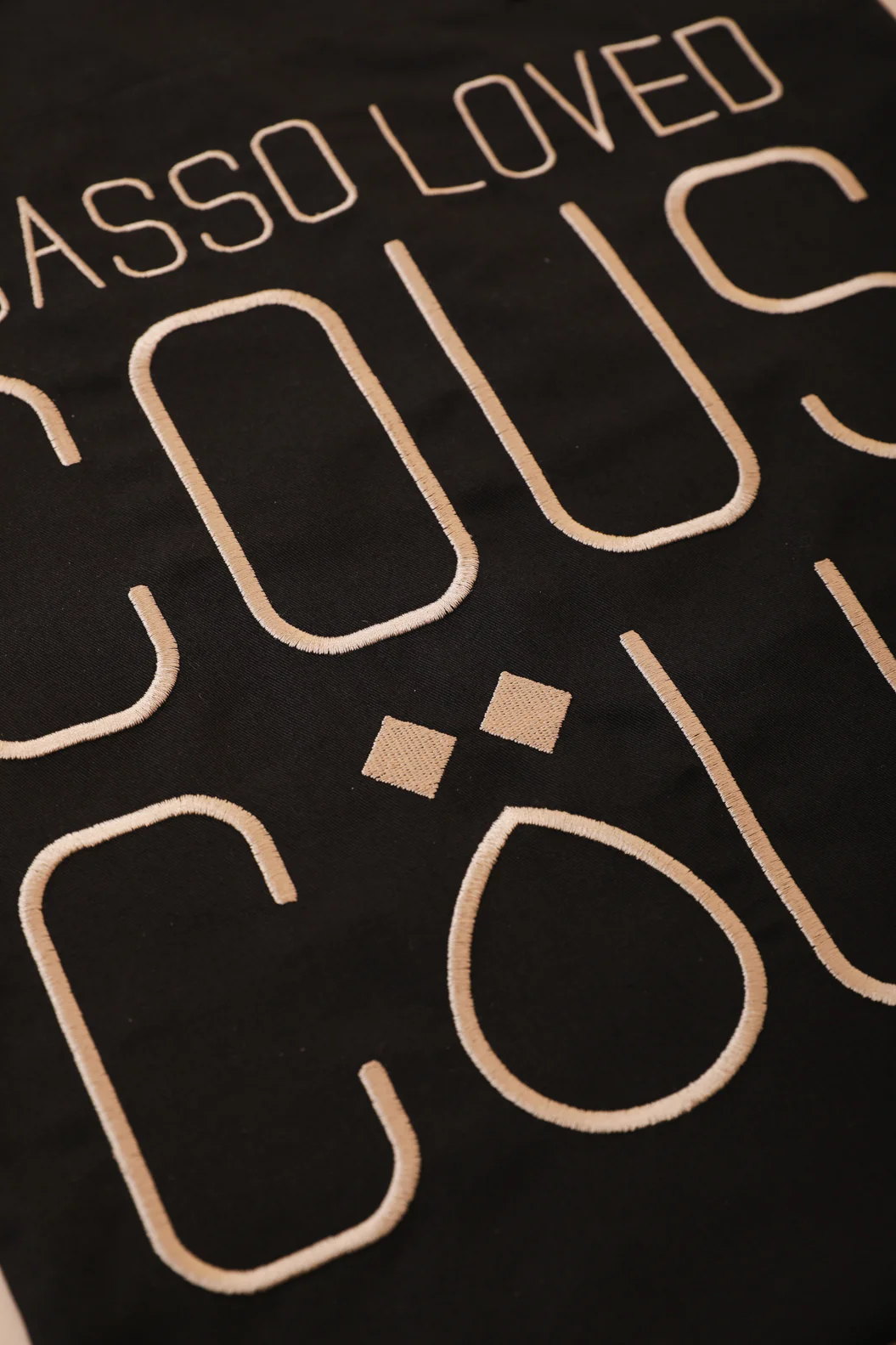 Broderie ‘Picasso loved Couscous’ sur un côté couleur beige clair.