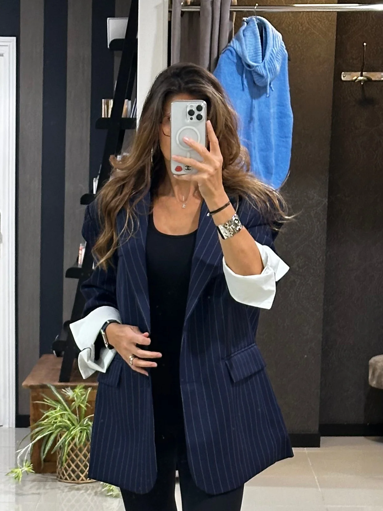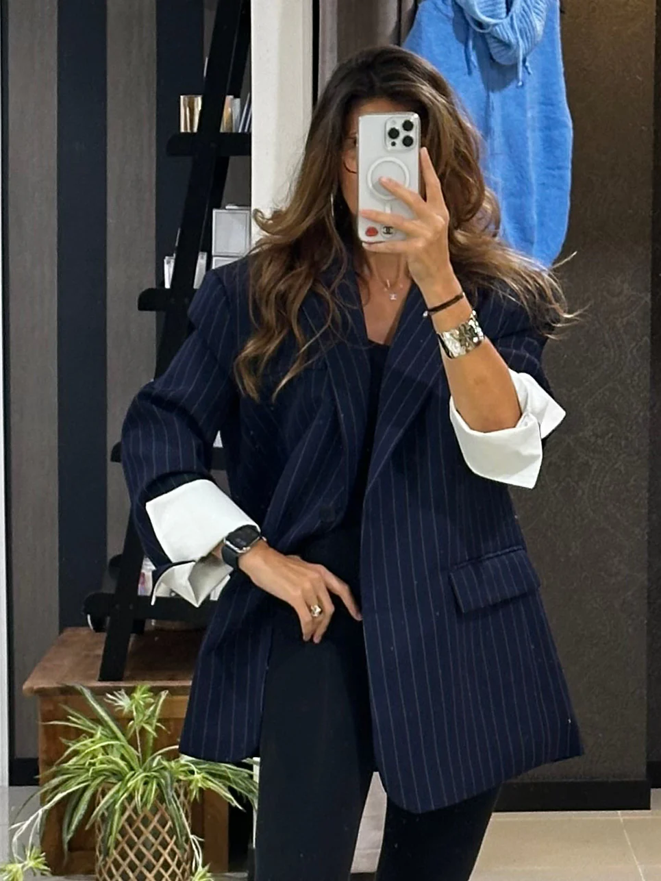 Veste oversize bleu marine à fines rayures, au style chic et intemporel.