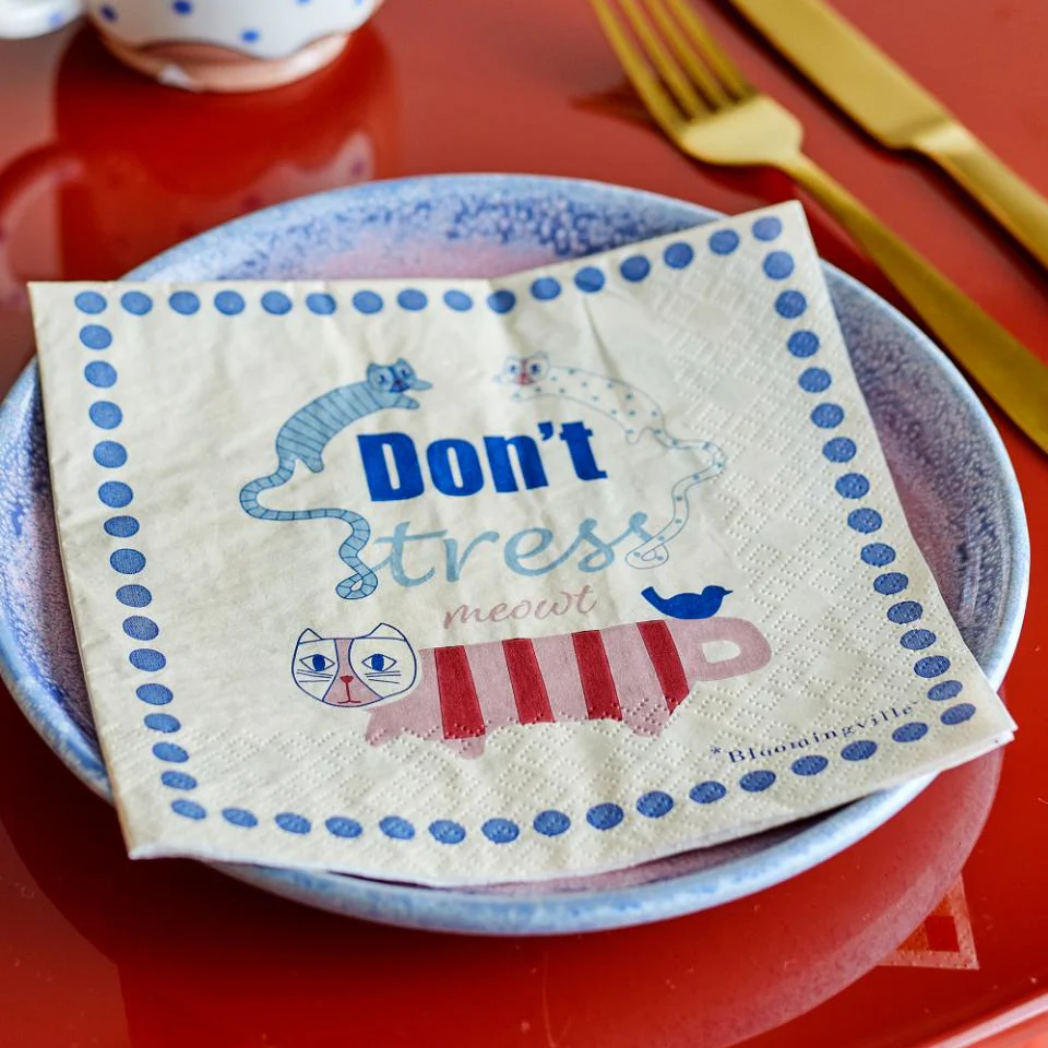 La Serviette Wine de Bloomingville est présentée dans un design recto-verso. D’un côté, il y a un motif abstrait ludique en couleurs pastel, tandis que de l’autre côté, il y a une citation qui ajoute une tonalité décontractée et amusante à la mise en table.