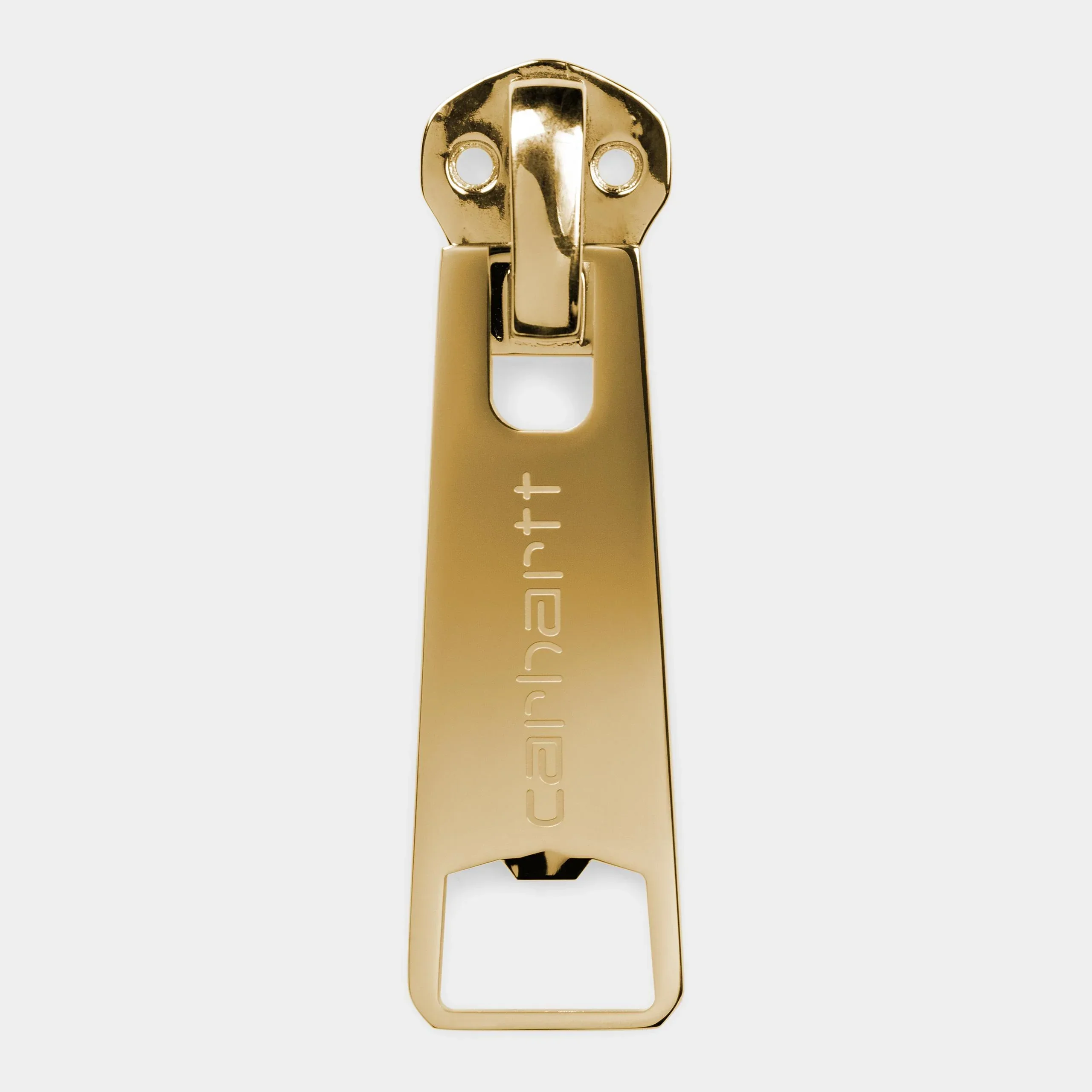 Le décapsuleur ‘Zip’ est conçu en acier inoxydable plaqué or. Il reprend la forme d’un zip classique Carhartt WIP et se compose de deux éléments : un support mural et le décapsuleur lui-même. Le logo est gravé à l’avant et à l’arrière.